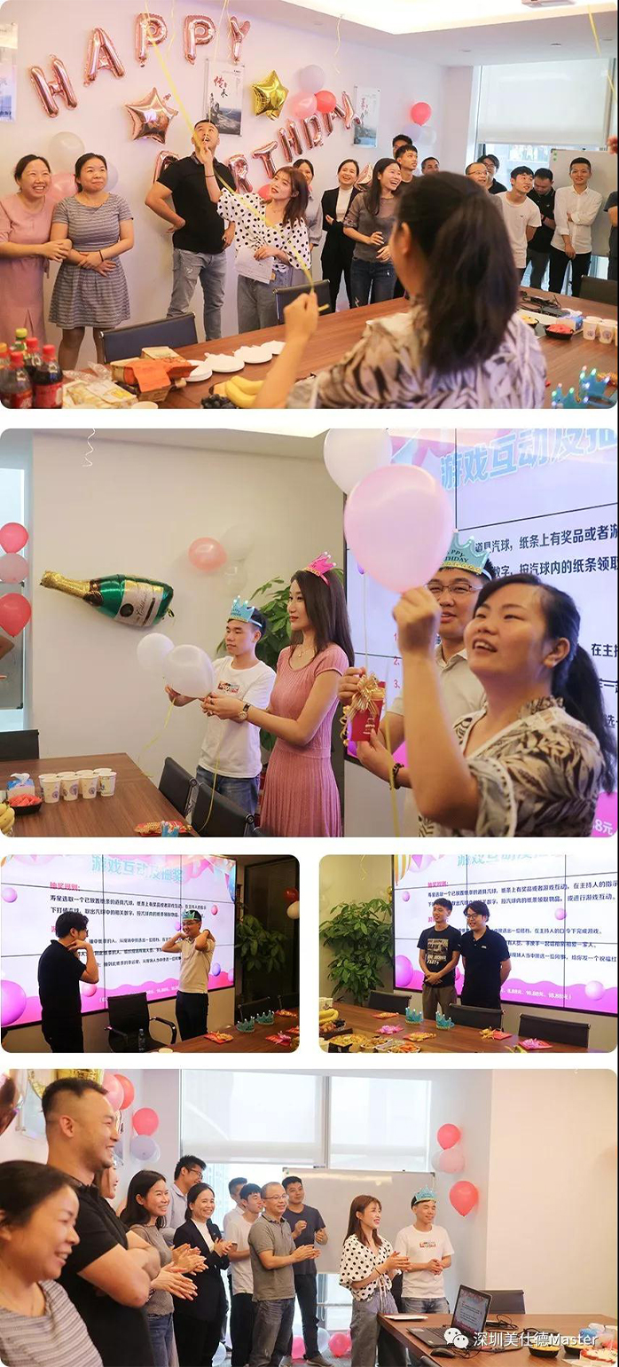 在游戏互动环节寿星们在主持人指示下,选取装有纸条的气球,气球里的纸条写着小愿望,可以让在场的同事们帮忙实现,现场热烈掌声不断,充满了欢声笑语。