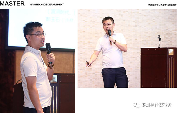 随后维保部经理叶长春就维保及二装工程项目管理两个方面的工作进行了总结汇报,并在会上进行了项目品质案例及典型问题处理方案的分享交流。维保管理方面从维保部主要工作职责、维保团队职能和管理区域划分、维保技术规范方案标准及下半年部门整体工作计划做出了详细的阐述;二装工程项目管理上,指出项目施工将从服务、方案、施工、材料、质量等多方面严格按规范进行管理,真正做到把服务和口碑放在首位。